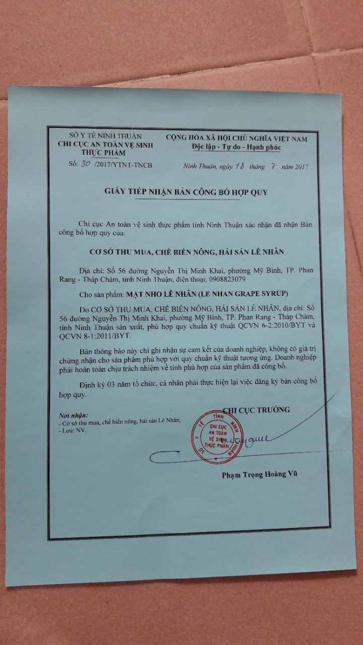Nếu bạn đã từng lang thang đến những vườn nho ở Ninh Thuận bạn sẽ không thể nào quên cái cảm giác thích thú khi nhìn những chùm nho chín mọng lủng lẳng trên đầu. Nho với quê hương tôi như một thứ đặc sản dùng để khoe mẻ hay làm quà tặng cho bạn bè, người thân mà chúng tôi yêu mến. Mật Nho Lê Nhân là thứ mà những người bạn tôi thích thú nhất.