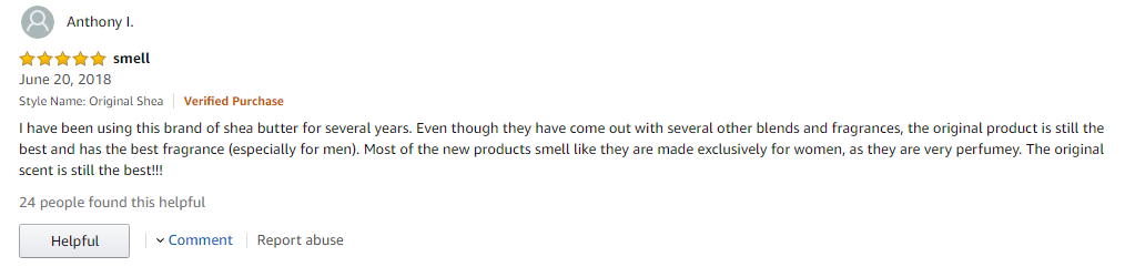 Tôi đã và đang sử dụng thương hiệu bơ hạt mỡ này trong nhiều năm. Mặc dù họ đã đưa ra một số hỗn hợp và mùi hương khác, sản phẩm ban đầu vẫn là tốt nhất và có mùi thơm tốt nhất (đặc biệt là đối với nam giới). Hầu hết các sản phẩm mới có mùi giống như chúng được sản xuất dành riêng cho phụ nữ, vì chúng rất thơm. Mùi hương ban đầu vẫn là tốt nhất !!!