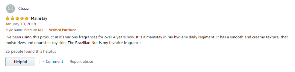 Tôi đã sử dụng mùi hương này trong hơn 4 năm nay. Đó là sản phẩm không thể thiếu trong việc chăm sóc than thể hàng ngày của tôi. Nó có một kết cấu mịn giúp giữ ẩm và nuôi dưỡng làn da của tôi. Nut Brazil là hương thơm yêu thích của tôi.