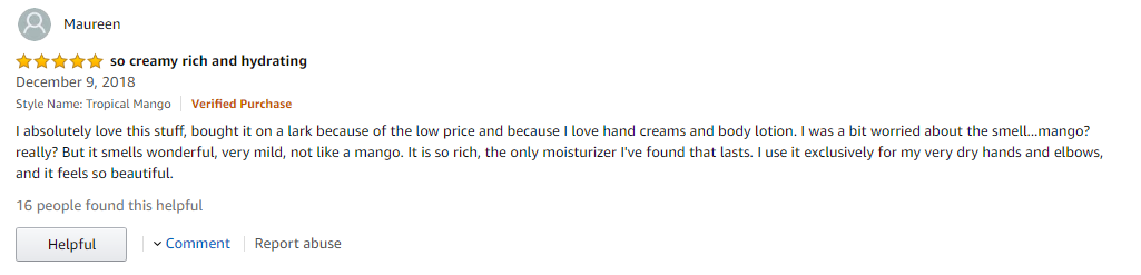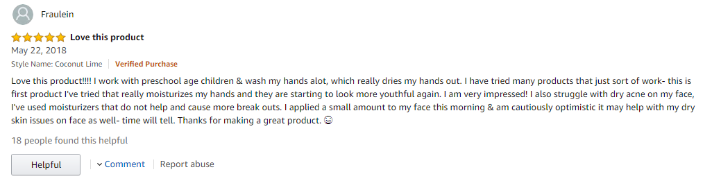 Yêu sản phẩm này !!!! Tôi làm việc với trẻ em ở độ tuổi mẫu giáo và phải rửa tay rất nhiều, điều đó thực sự làm khô tay tôi. Tôi đã thử nhiều sản phẩm mà chỉ là loại này là cho hiệu quả tốt, bàn tay của tôi thật sự đã được giữ ẩm và chúng đang bắt đầu trông trẻ trung hơn nữa. Tôi rất ấn tượng! Tôi cũng vật lộn với mụn trứng cá khô trên mặt, tôi đã sử dụng các loại kem dưỡng ẩm nhưng không giúp ích và thậm chí gây ra nhiều mụn hơn. Tôi áp dụng một lượng nhỏ lên mặt của tôi sáng nay và hy vọng nó có thể giúp các vấn đề da khô của tôi. Cảm ơn đã làm một sản phẩm tuyệt vời.
