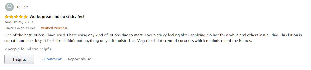 Một trong những loại kem dưỡng da tốt nhất mà tôi đã sử dụng. Tôi ghét sử dụng bất kỳ loại kem dưỡng da do hầu hết để lại cảm giác dính sau khi áp dụng. Kem dưỡng da này mịn và không dính. Cảm giác như tôi đã không đặt bất cứ thứ gì lên da mình nhưng nó giữ được độ ẩm. Mùi dừa rất đẹp làm tôi nhớ đến những hòn đảo nhiệt đới.