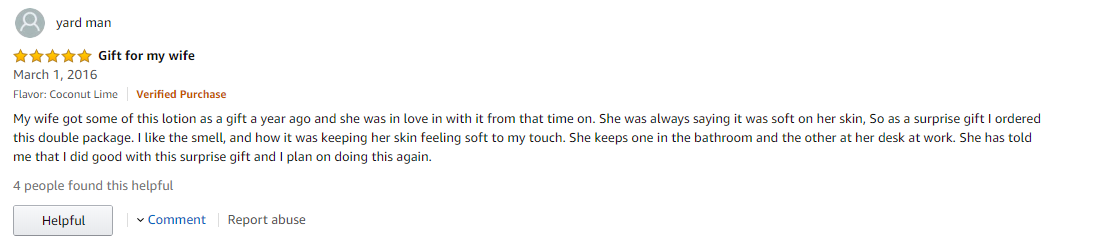 Vợ tôi đã nhận được một số kem dưỡng da này như một món quà một năm trước và cô ấy đã yêu nó từ thời điểm đó. Cô ấy luôn nói rằng nó mềm mại trên da của cô ấy, vì vậy như một món quà bất ngờ, tôi đã đặt mua sản phẩm này. Tôi thích mùi này, và tôi tự hỏi làm thế nào nó giữ cho làn da của cô ấy mềm mại khi chạm vào tôi. Cô ấy có một cái trong phòng tắm và cái còn lại ở bàn làm việc. Cô ấy đã nói với tôi rằng tôi đã thật tâm lý với món quà bất ngờ này và tôi dự định làm lại nhiều lần nữa.