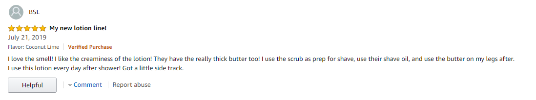 Tôi yêu mùi hương! Tôi thích độ mịn của kem dưỡng da! Họ có thành phần bơ thực sự quá dày! Tôi sử dụng tẩy tế bào chết sau khi tẩy lông, sử dụng dầu cạo râu của họ và sử dụng bơ trên chân của tôi sau đó. Tôi sử dụng kem dưỡng da này mỗi ngày sau khi tắm! Có một chút theo dõi bên.