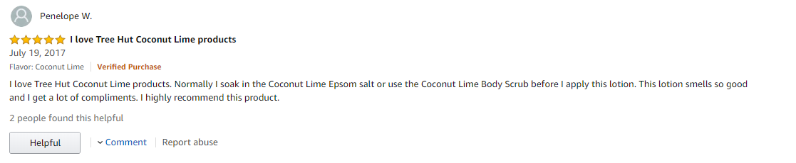 Tôi yêu sản phẩm chanh dừa của Tree Hut. Thông thường tôi sẽ ngâm mình trong Coconut Lime Epsom hoặc sử dụng tẩy tế bào chết chiết xuất từ Dừa trước khi tôi thoa kem dưỡng da này. Kem dưỡng da này có mùi rất tốt và tôi nhận được rất nhiều lời khen ngợi của người khác về làn da của mình sau khi dùng. Tôi đánh giá cao sản phẩm này.